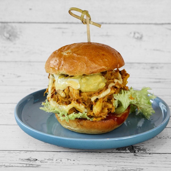 - Chickenburger: Chicken-Patty, Tomate, karamellisierte Zwiebeln, Gewürzgurke, süßsaure Sauce, Salat, hausgemachte Sauce