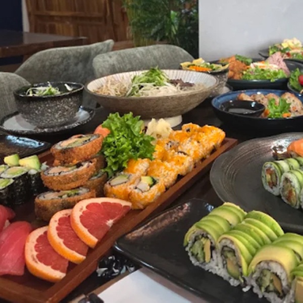 Wähle aus vielen Asia-Vorspeisen und Dessertklassikern und genieße gemeinsam die XXL-Lachs-Sushi-Platte mit Maki, Nigiri und Hot Rolls uvm.