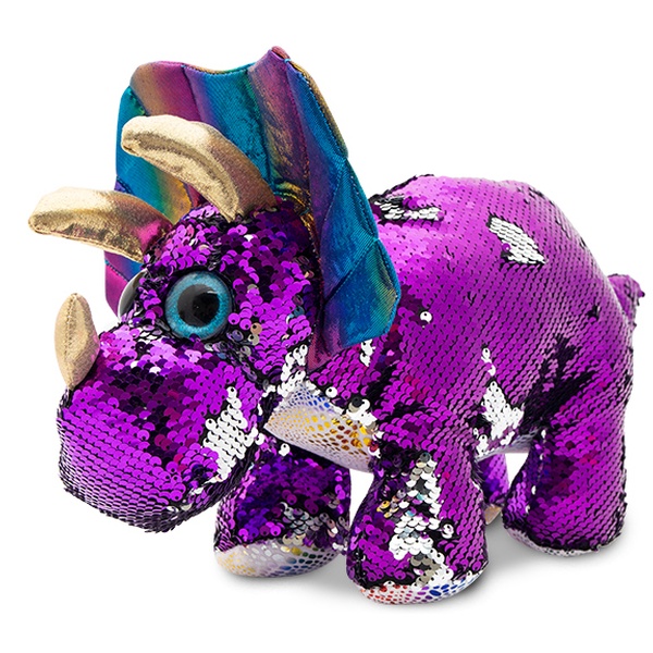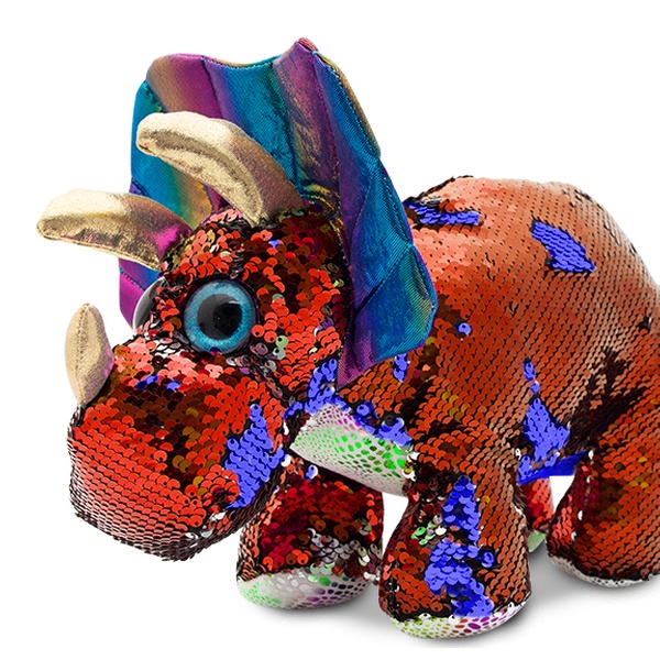 Triceratops-Kuscheltier mit bunten Pailletten und glänzenden Augen
