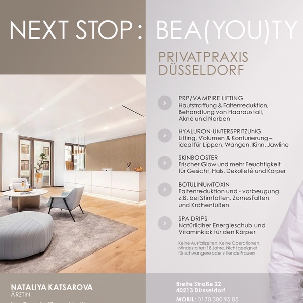 Die Privatpraxis für Ästhetische Medizin bietet ärztliche durchgeführte Leistungen zur Verjüngung und Verschönerung für Frauen und Männer ab 18. Wir arbeiten fast ausschließlich mit natürlichen (z. B. PRP) oder naturidentischen Substanzen ( z.B. Hyaluron), denn natürliche Schönheit steht im Fokus unserer Arbeit. Wir bieten eine komplette Palette der gängigen Therapieverfahren zur Verjüngung und Verschönerung: PRP, Skinbooster (z.B. Profhilo, Philart ), Botulinum, Hyaluron, Laser etc.. Keine Operationen. Keine Ausfallzeiten.Wir beraten Sie gern !