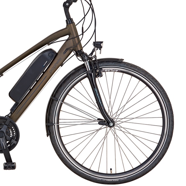 Ein E-Fahrrad mit Aluminium-Rahmen, Alu-V-Bremsen und 24-Gang-Kettenschaltung