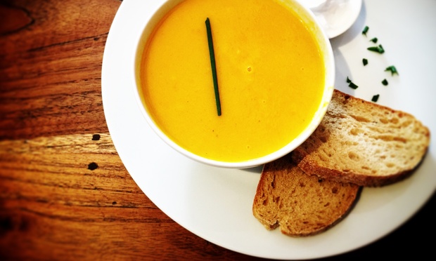 • 1. Gang: Spargelcremesuppe mit Spargelstückchen und Mandelblättern