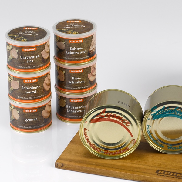 - 6 Dosen à 200 g (Schinkenwurst, Lyoner, Hausmacher Leberwurst, Bierschinken, Bratwurst grob, Sahne-Leberwurst)