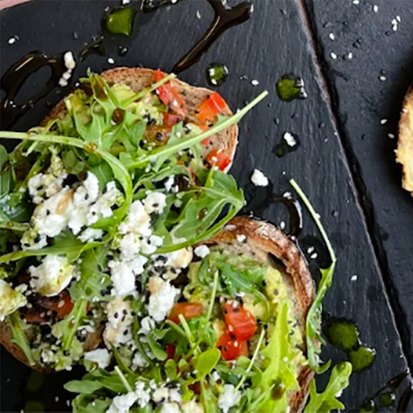 - Toast mit Hummus: Cremige Kichererbsen, Tomaten, Rucola, Granatapfel, Sesam