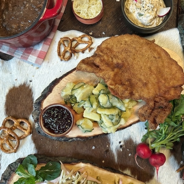 • Schnitzel „Wiener Art“: von der Oberschale vom Schwein serviert mit Preiselbeeren & Erdäpfel-Gurkenalat (Kartoffel-Gurkensalat)