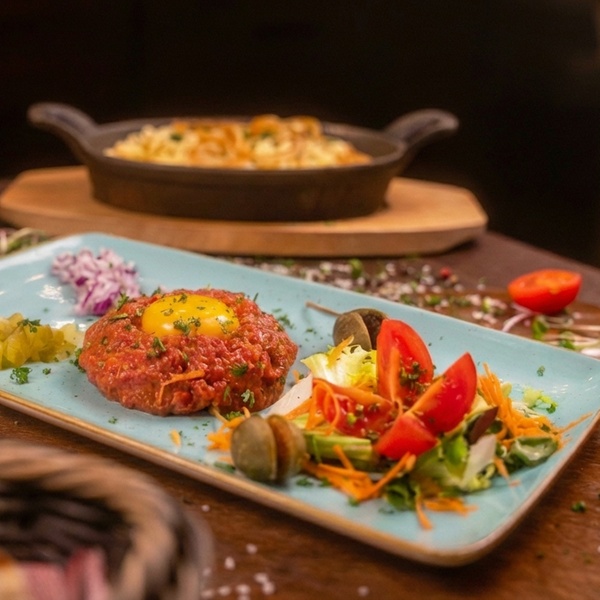 • Beef Tartar (120 g) frisch gewolftes Beef Tatar | gewürzt mit Eidotter & Zwiebeln | dazu Bauernbrot & Butter