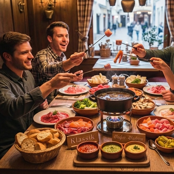 • „Klassik“-Fondue: Kräftige Bouillon, argentinische Rinderhüfte, Schweinefilet, Hähnchenbrustfilet, wilder Broccoli, Champignons, Frühlingszwiebeln, ofenfrisches Baguette & pikante Mixed Pickles