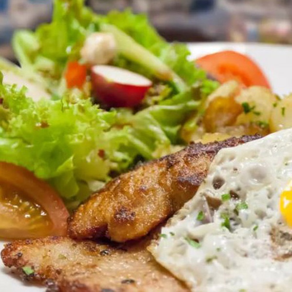- Hamburger-Schnitzel: Paniertes Schweineschnitzel mit Spiegelei, Bratkartoffeln und kleinem Salat