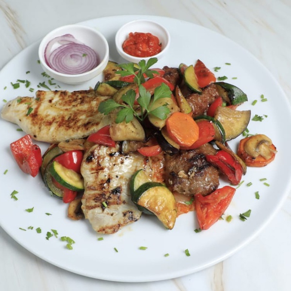 • Balkan Platte (Kalb‑, Rinder‑, Hähnchensteak plus Cevapcici, Pleskavica, Reis, Gemüse)
