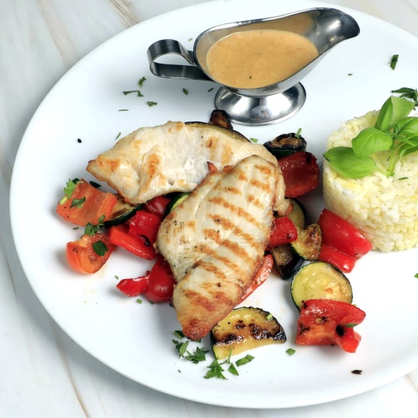 • Gegrillte Hähnchenbrust (mit Risotto und Gemüse)