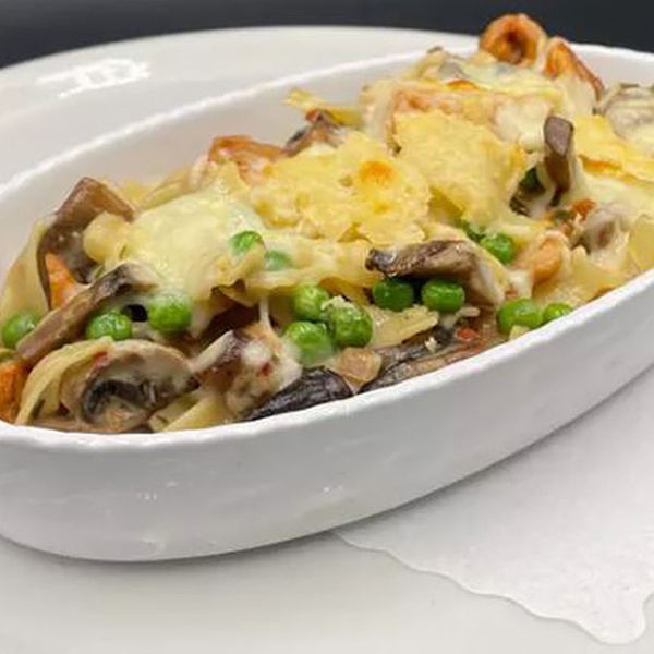 • Tagliatelle Hähnchen: Hähnchenbruststreifen, Champignons & Erbsen in einer Sahnesauce