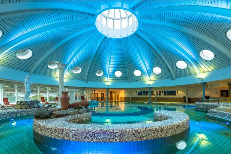 - Innen-Thermalbecken (ca. 31 °C) mit Unterwasserbänken, Whirlpool & textiler Dampfsauna