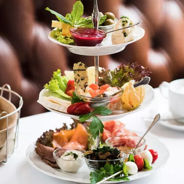 Entspannter Start in den Tag mit einer reichhaltigen Frühstücks-Etagere mit Aufschnitten, Antipasti, Omelett, Gebäck sowie Orangensaft