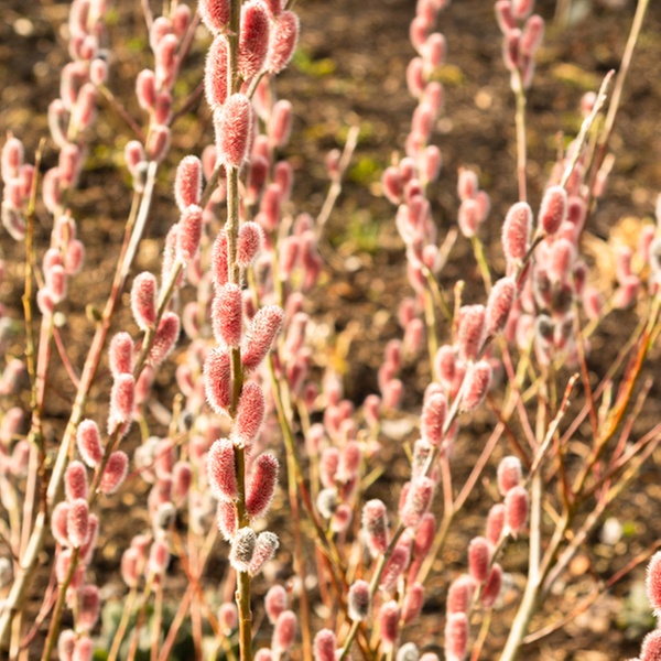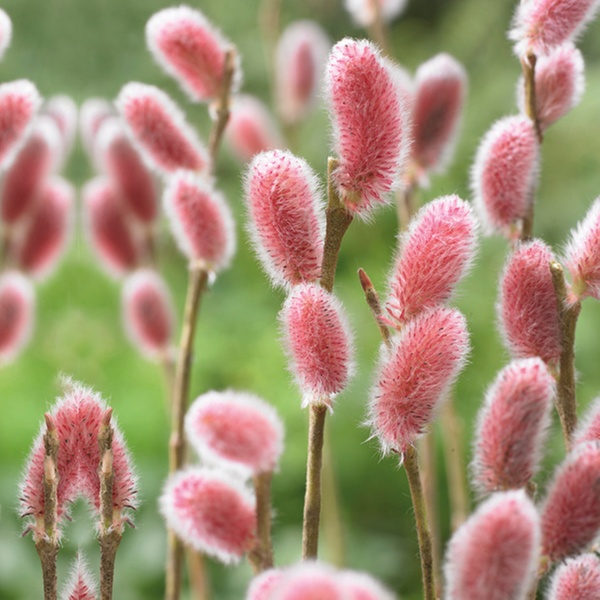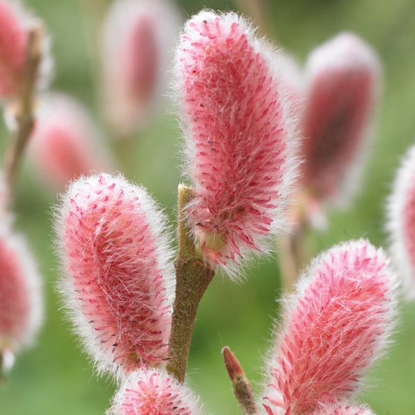 - Große, auffällig rosa gefärbte Kätzchenblüten mit weißer, feiner Behaarung
