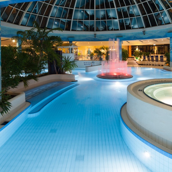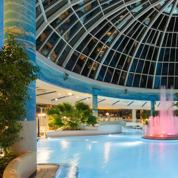 Gäste genießen Freizeit und Wellness auf über 18.000 qm mit Freibadbereich, Whirlpool, sprudelnden Massage-Liegen, Saunen und Dampfbad