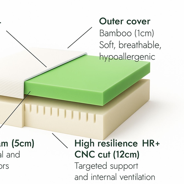 • Die CNC-geschnittene HR+-Schaumstoffbasis schafft differenzierte Komfortzonen (Schultern, Rücken, Beine) und verbessert die Luftzirkulation innerhalb der Matratze