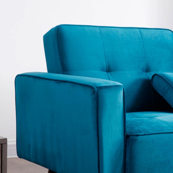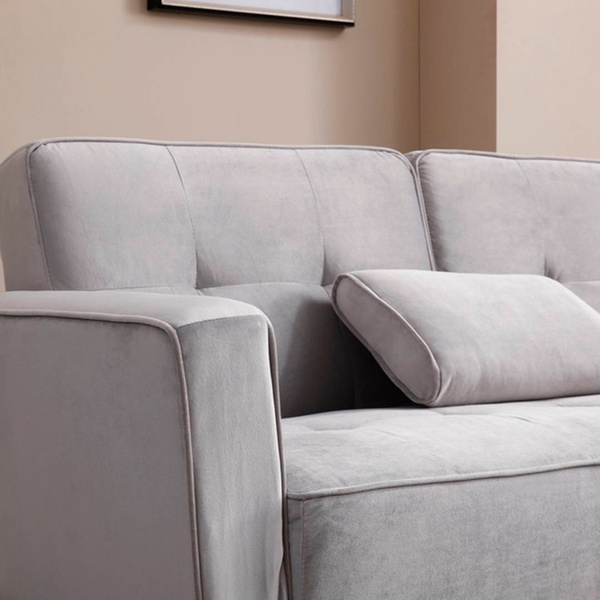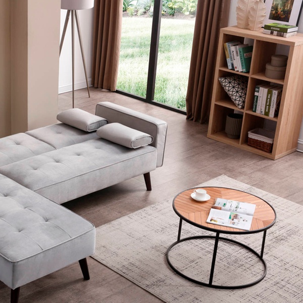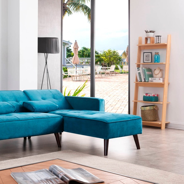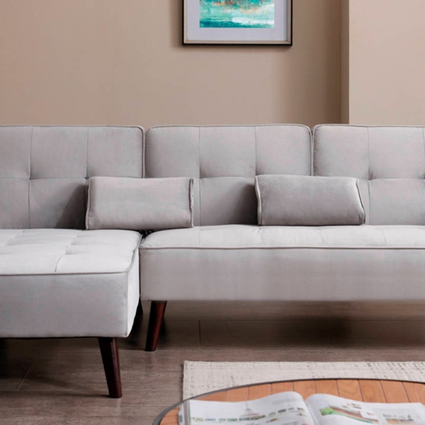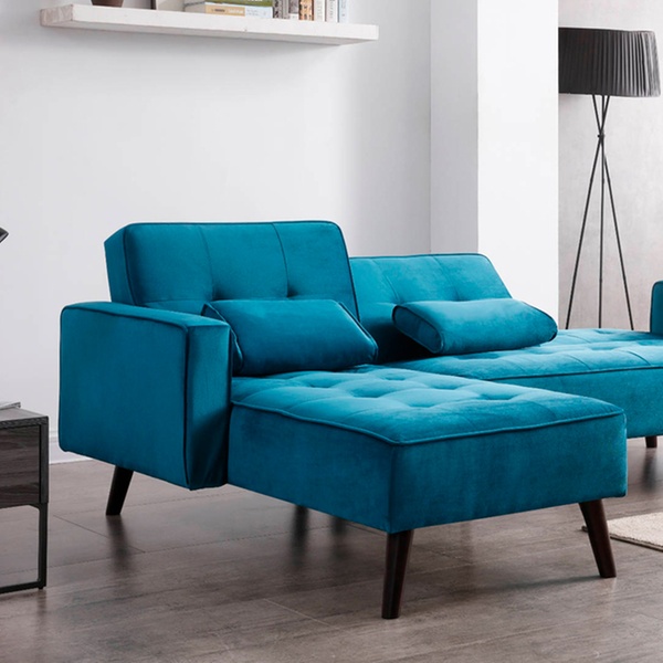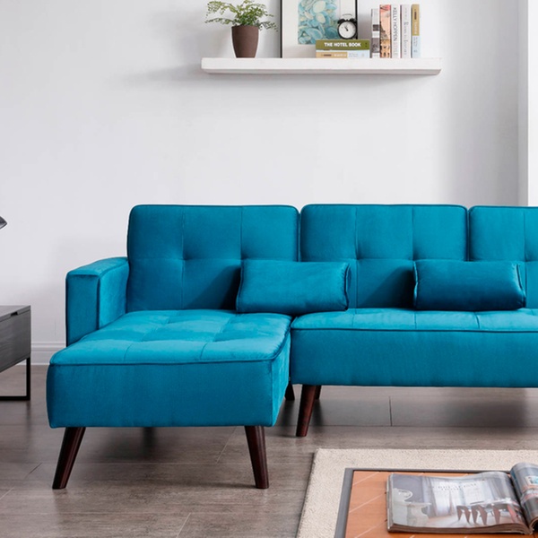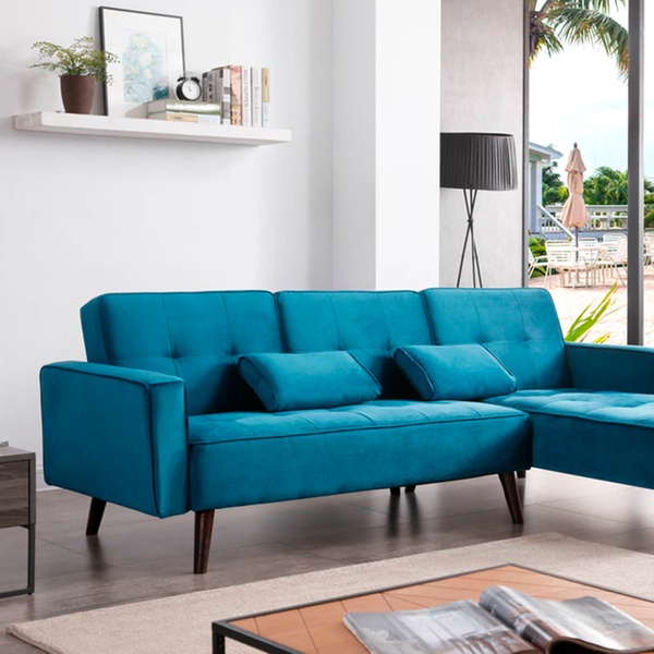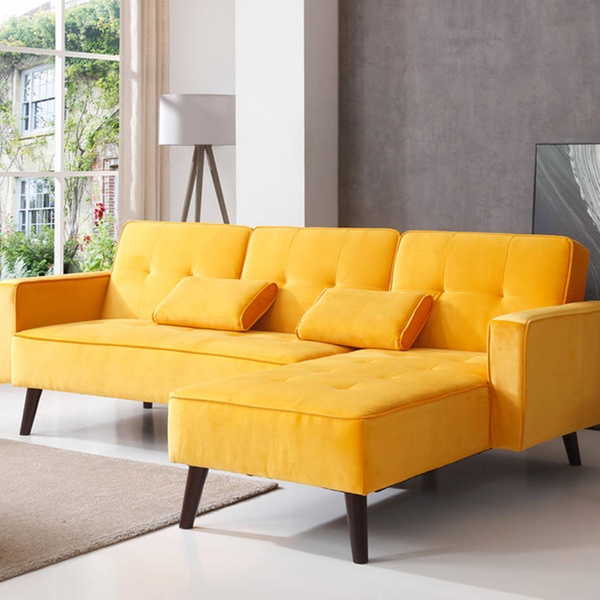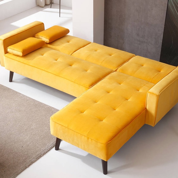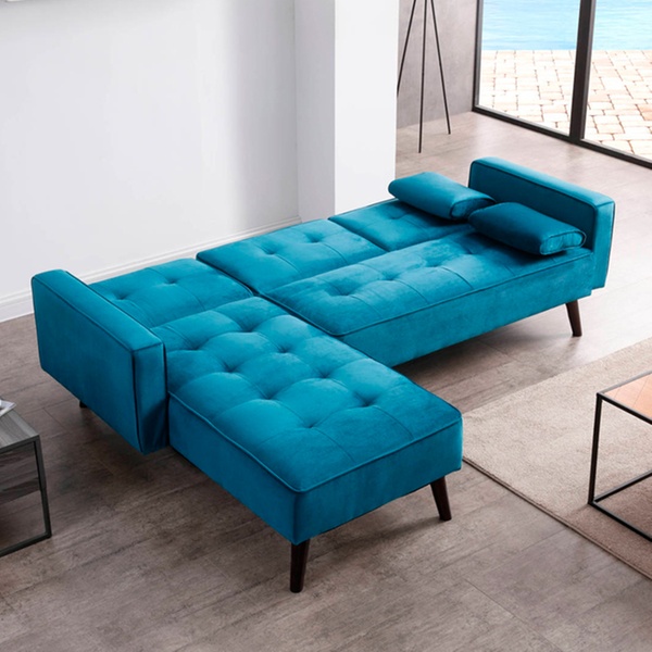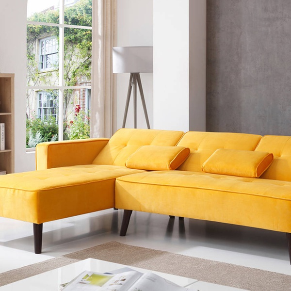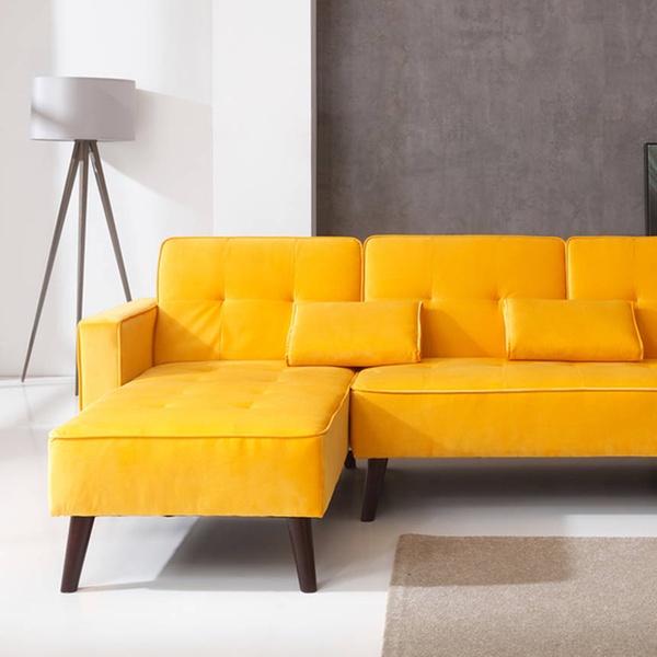 Dieses beidseitige Ecksofa mit Samt-Polsterung und Schlafffunktion soll sich in verschiedene Räumlichkeiten harmonisch einfügen