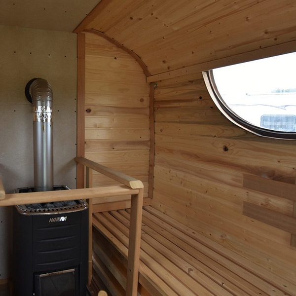 Genieße maritimen Komfort in einer mobilen, holzbeheizten Sauna mit atemberaubendem Ausblick und direktem Zugang zur Ostsee