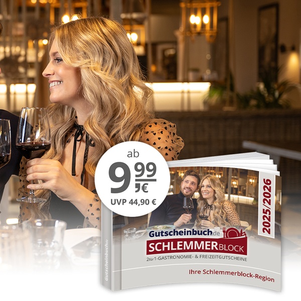Mit dem Gutscheinbuch.de Schlemmerblock 2025/2026 entdeckst du deine Stadt und Region kulinarisch und erlebnisreich neu. Im praktischen Pocketformat bietet er zahlreiche 2-für-1-Gutscheine aus den Bereichen Gastronomie, Freizeit und Wellness – perfekt für alle, die kulinarische Highlights, entspannende Wohlfühlorte und spannende Aktivitäten direkt vor der Haustür erleben möchten.