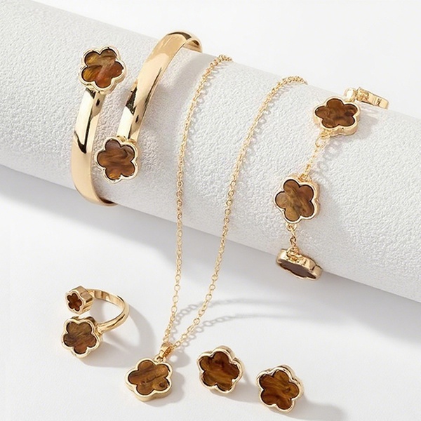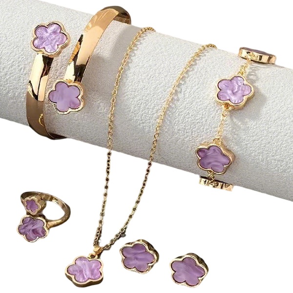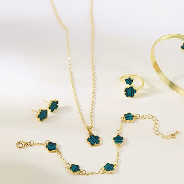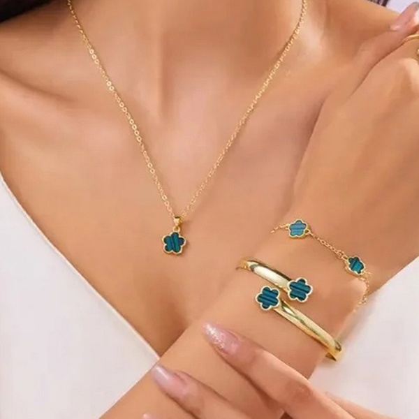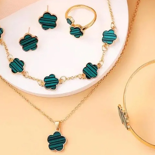Dieses elegante Schmuck-Set bestehend aus Halskette, Armband, Armreif, Ohrstecker und Ring wertet jedes Outfit auf und steht mit dem Kleeblatt-Design für Wohlstand und Glück