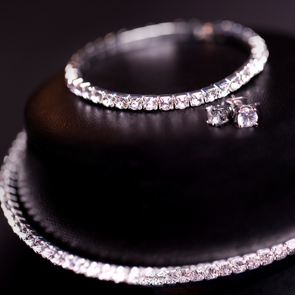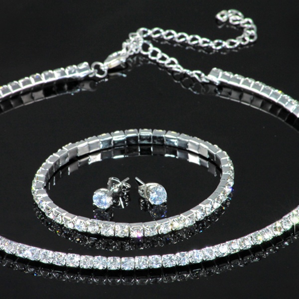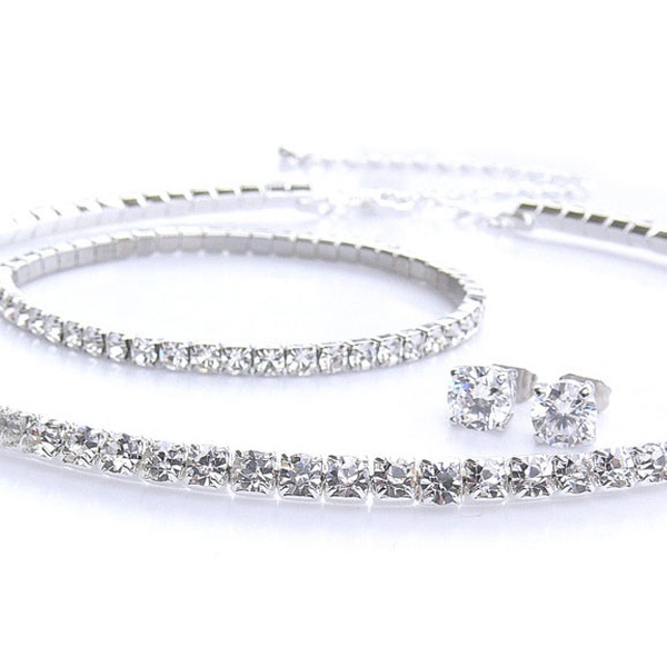 Ein elegantes Schmuck-Set bestehend aus Halskette, Armband und Ohrstecker verziert mit runden, funkelnden Kristallen