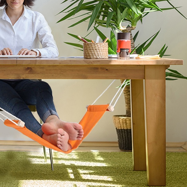 Entspannung für die Füße durch längenverstellbare Hängematte, die mittels Metallklammern am Schreibtisch befestigt wird