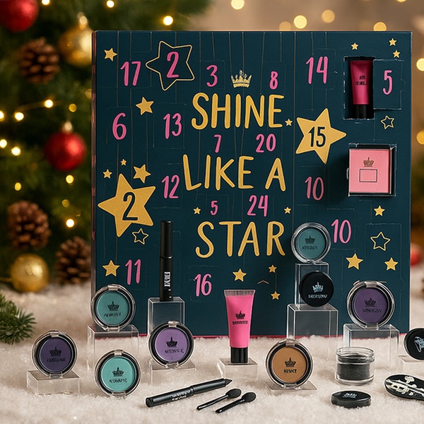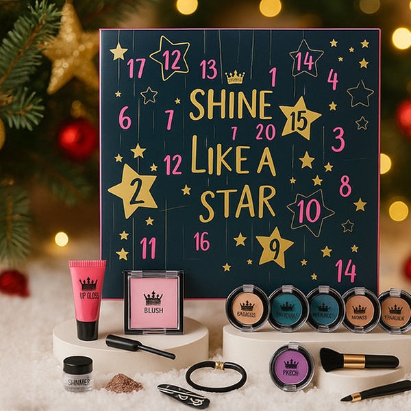 Der Beauty-Adventskalender enthält Schmuck, Make-up, Pinsel und Glitzerpuder und ist eignet sich als festliches Geschenk für Freunde, Familie odersich selbst