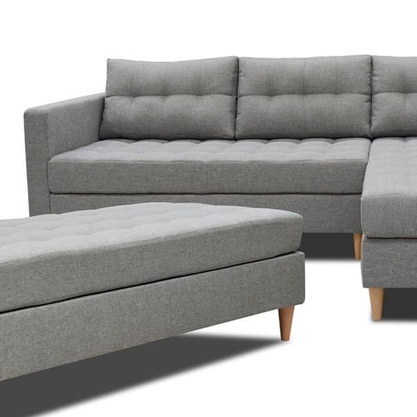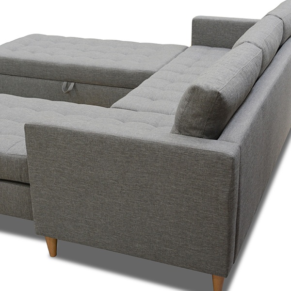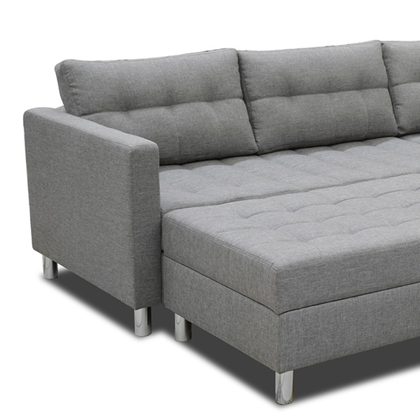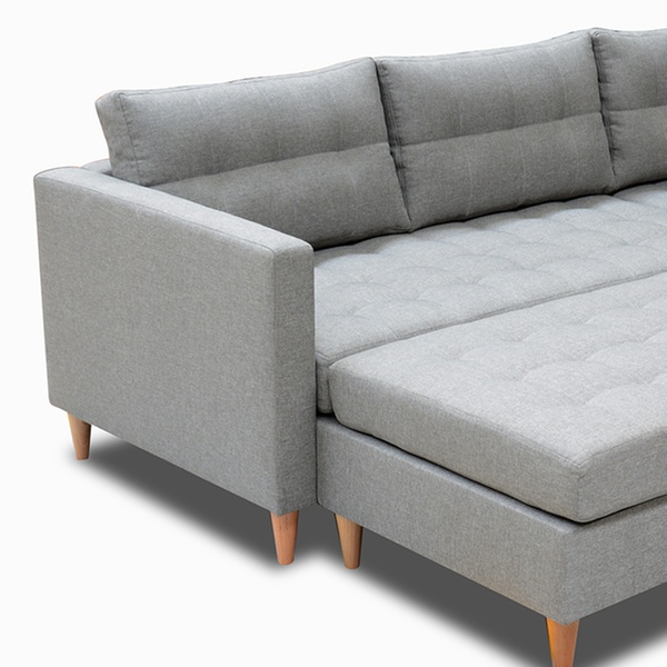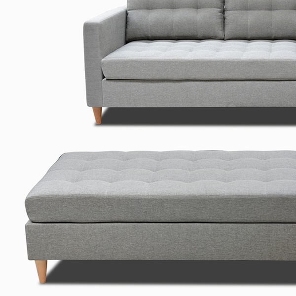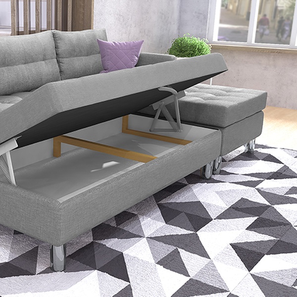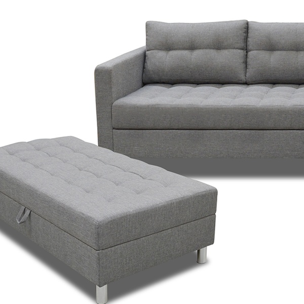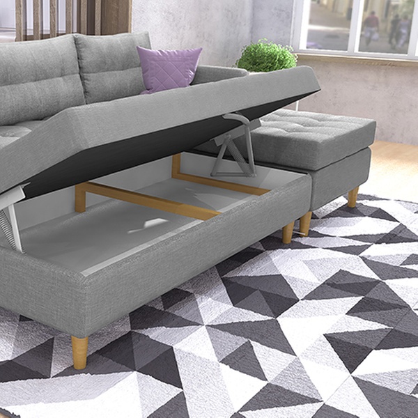 Ein funktionales und modernes Sofa mit Schlaffunktion und viel Stauraum, wahlweise mit großem Hocker