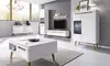 Eine stilvolle Wohnwand Living mit glänzenden Fronten in Weiß/Eiche, wahlweise mit LED-Beleuchtung