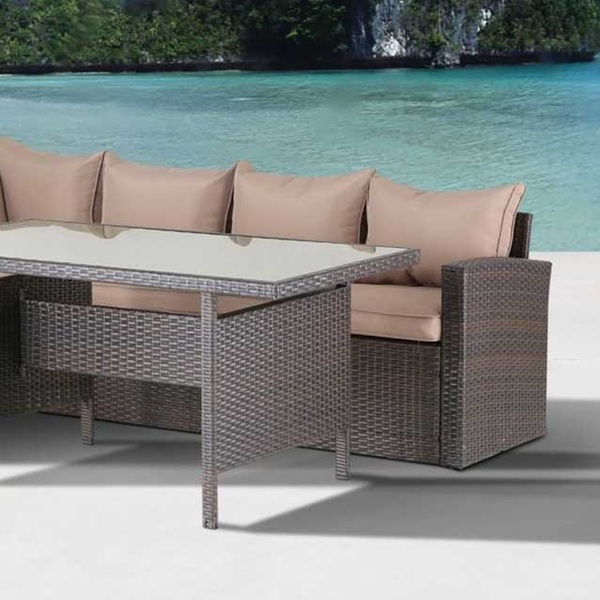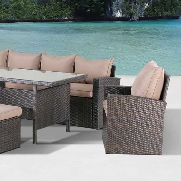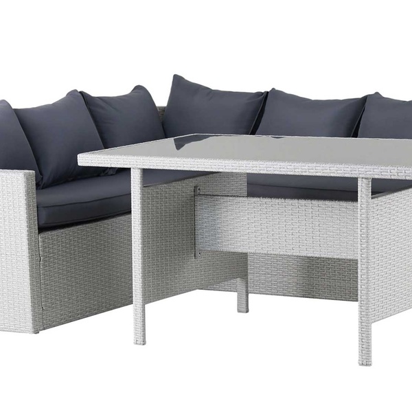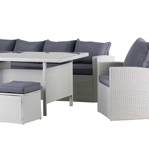 Bequeme Eck-Lounge aus wetterfestem Polyrattan-Geflecht mit Sitzkissen, Tisch, optional mit 2 Hockern und einem Sessel