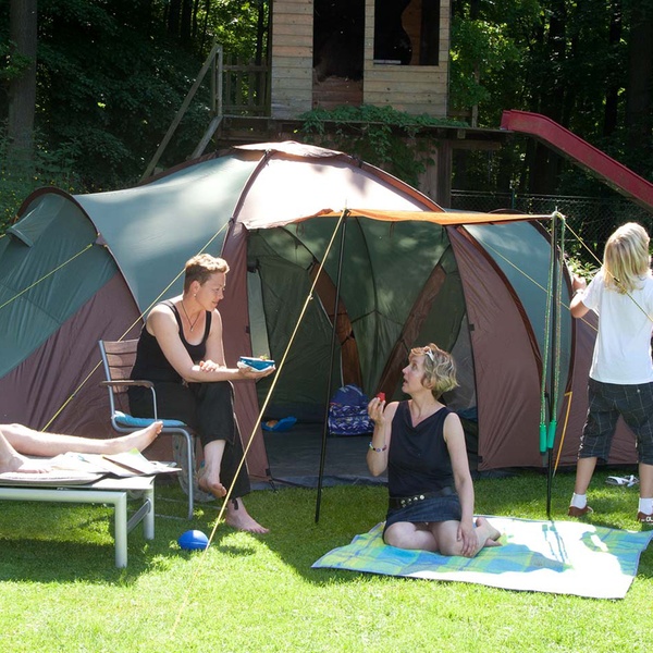 Dieses Zelt gleicht einer Ferienwohnung zum Mitnehmen für die ganze Familie mit drei Schlafzimmern, Wohnzimmer und schattiger Veranda