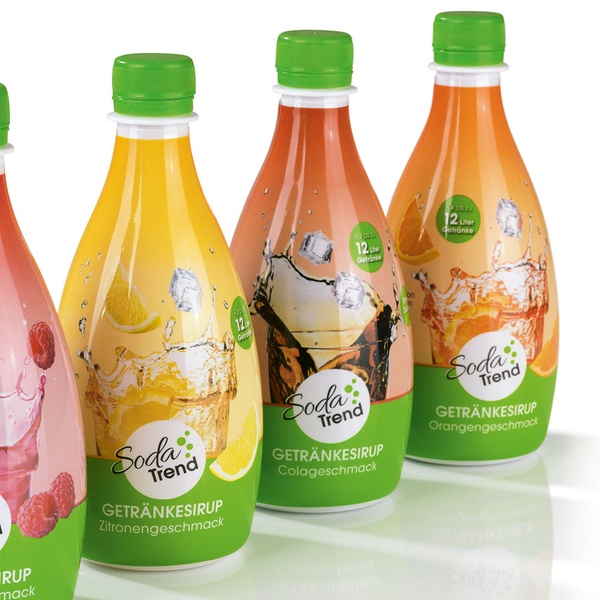 - Wahlweise mit vier verschiedene Getränkesirup (Zitrone, Orange, Himbeer und Cola), je 500 ml