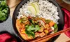 Com Lac (Erdnuss-Curry mit buntem Gemüse, Kokosmilch und einer Zutat deiner Wahl wie Lachs, Ente, Hähnchen, Tofu) serviert mit Reis
