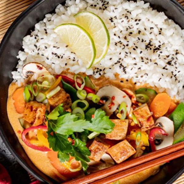 Com Lac (Erdnuss-Curry mit buntem Gemüse, Kokosmilch und einer Zutat deiner Wahl wie Lachs, Ente, Hähnchen, Tofu) serviert mit Reis