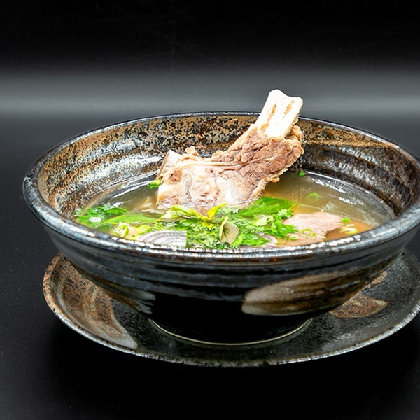 Tonkotsu (Schweinebrühe auf Sojasoße, Gemüse und Ei und und Beilage Schwein oder Hähnchen)