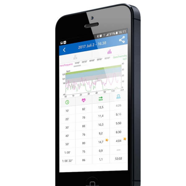 - Anzeige von u. a. Entfernung, Geschwindigkeit, Tempo, Herzfrequenzzone, Höhenlage, gelaufenen Runden uvm.