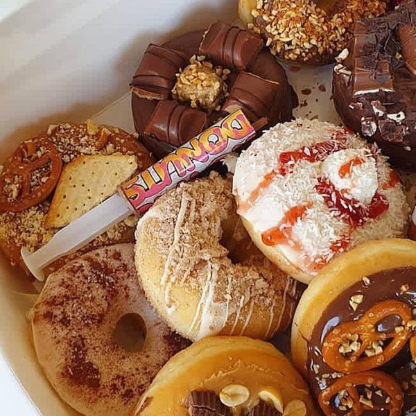 Zum Mitnehmen: Überraschungsbox mit frisch zubereiten Donut-Varianten, auf Wunsch auch vegan oder als Bomb mit üppigen Toppings