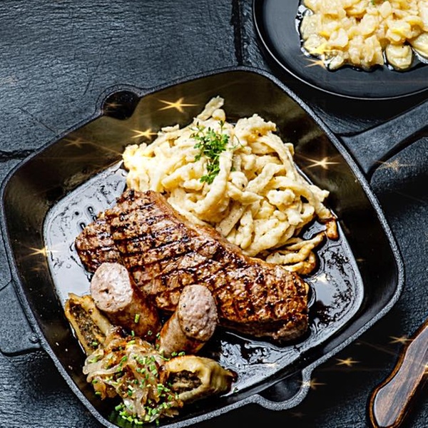 • Stüble Pfännle Deluxe: Rinderfilet, Mauldasche, Bratwurst, Bratkartoffeln und Beilagensalat