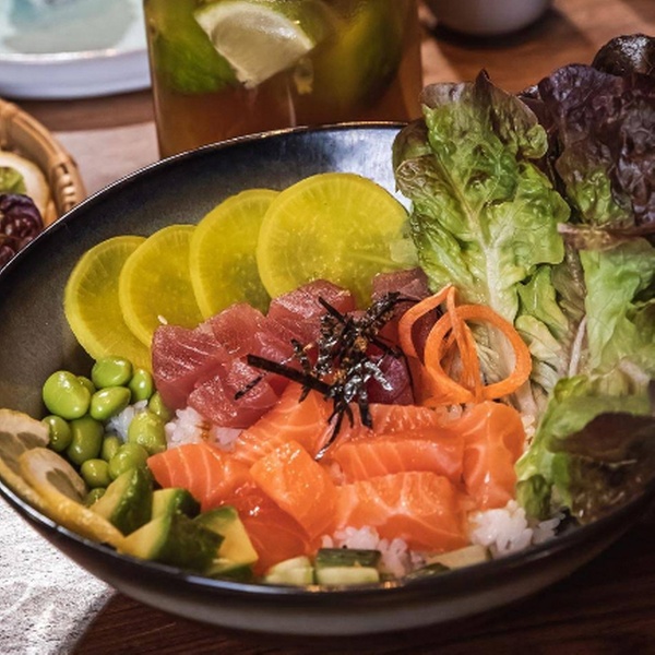- Ahi-Bowl: mit Thunfisch, Lachs, Sushi-Reis, Avocado, Edamame, gelbem Rettich, Algensalat, Gurke, Salat, Sesam, hausgemachtem Dressing, Sesamsoße und Röstzwiebeln