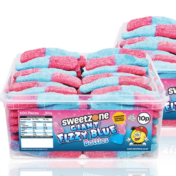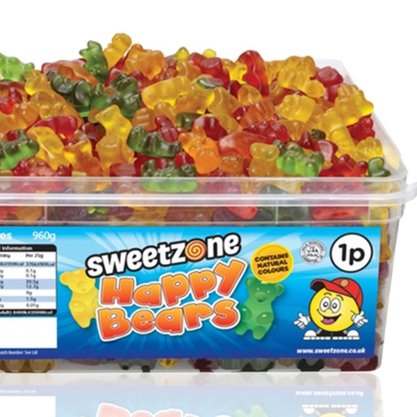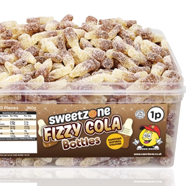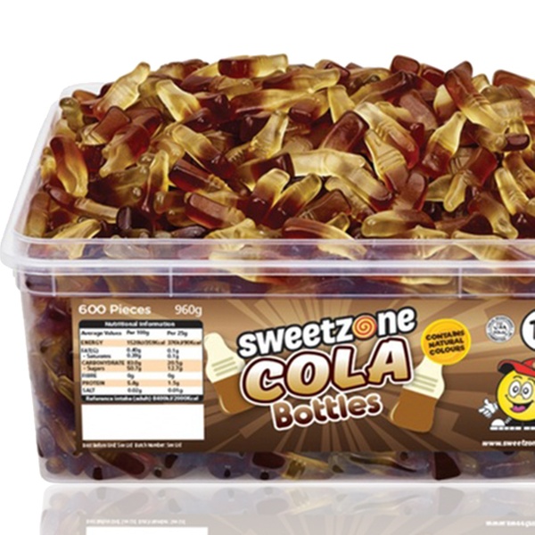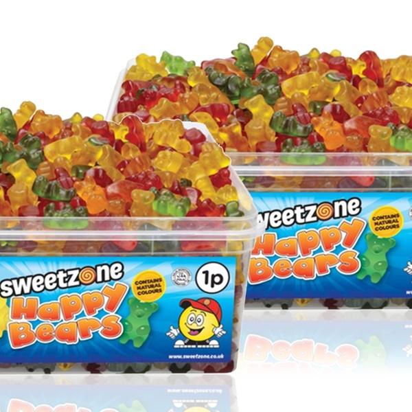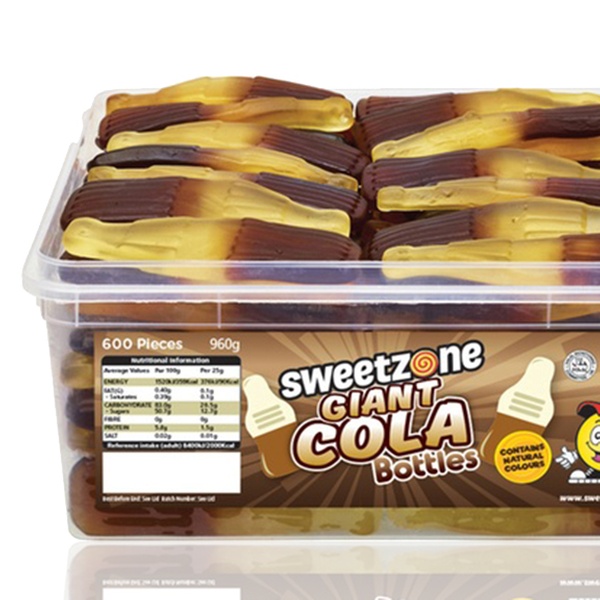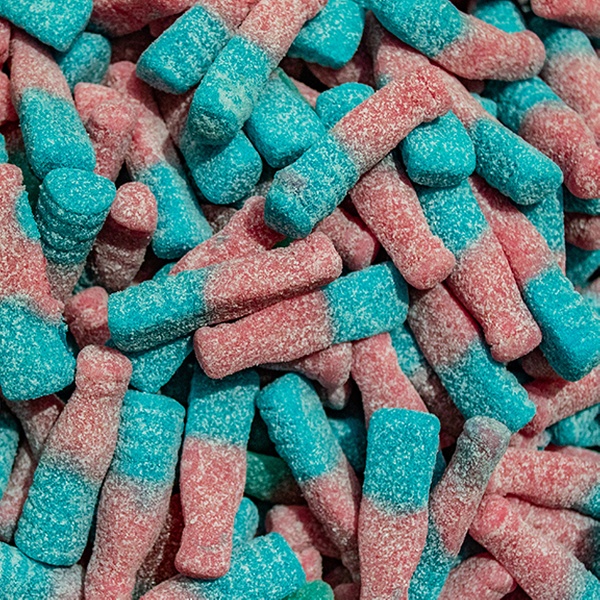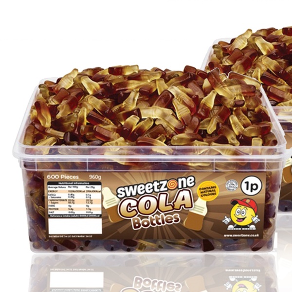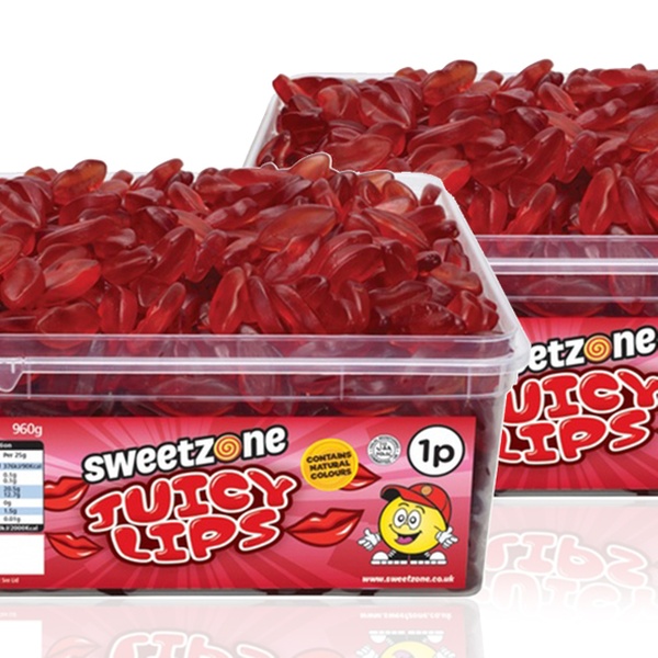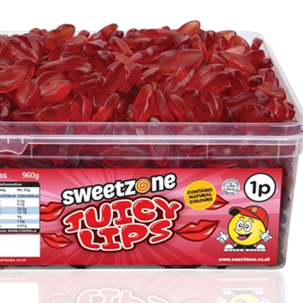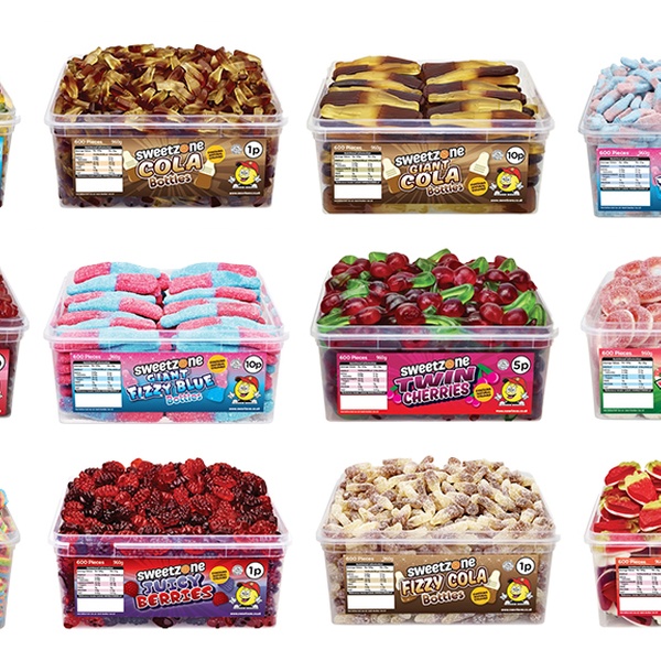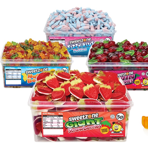 Eine Box mit der großen Menge von Gummibärchen verschiedener Sorten, wie zum Beispiel „Fizzy Cola Bottles“ oder „Juicy Lips“