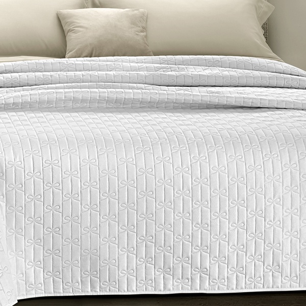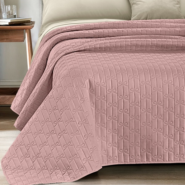 Eine Tagesdecke mit niedlicher Schleifenverzierung, die dank "Pfirsichhaut-Behandlung" kuschelig weich ist und angenehme Wärme bietet