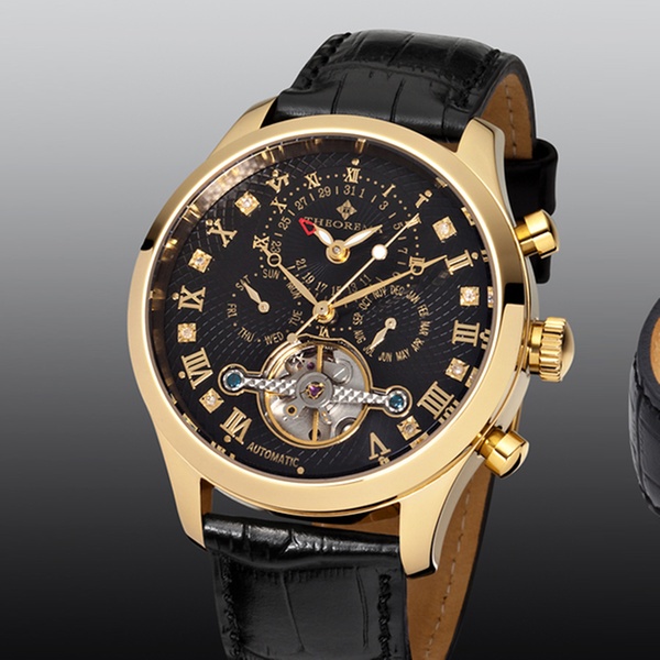 - Modell T3008-3: Gehäuse in Gold, Zifferblatt in Schwarz, Armband in Schwarz (Leder)