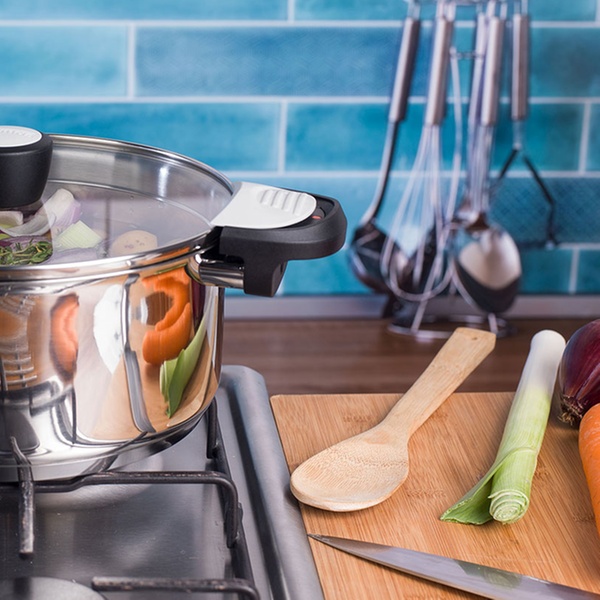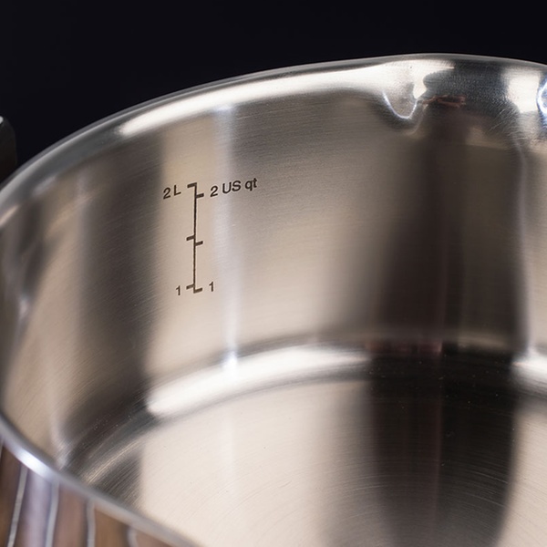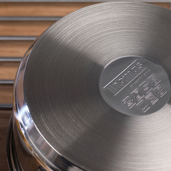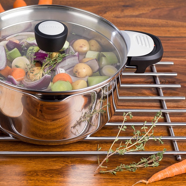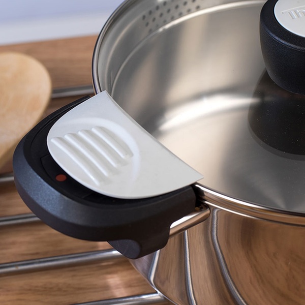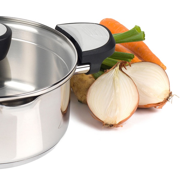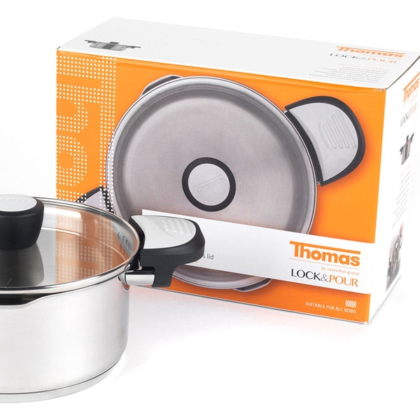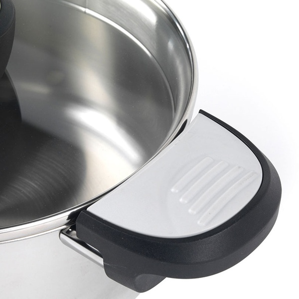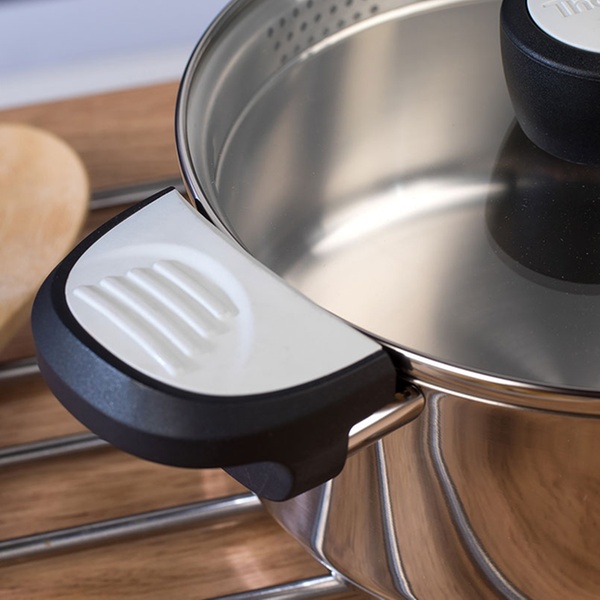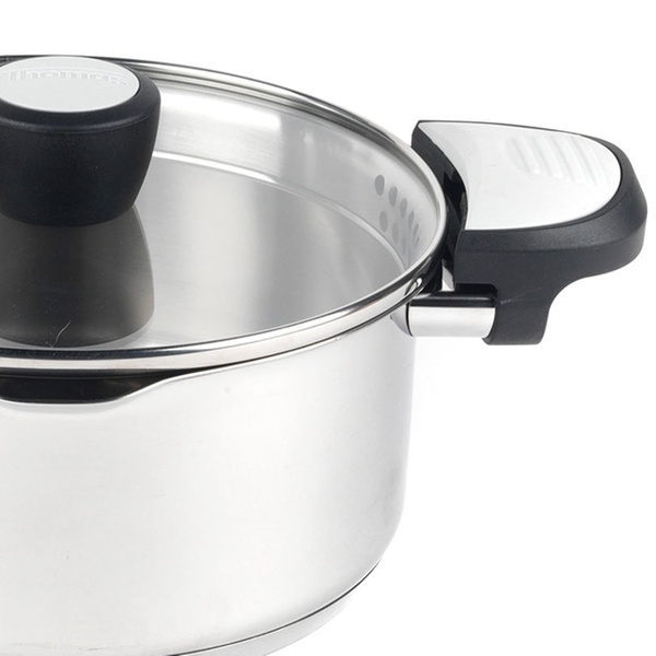 Edelstahl-Topf mit praktischer Einrast- und Ausschüttfunktion, Phenolharz-Griffen ist bis 180 ° C hitzenbeständig