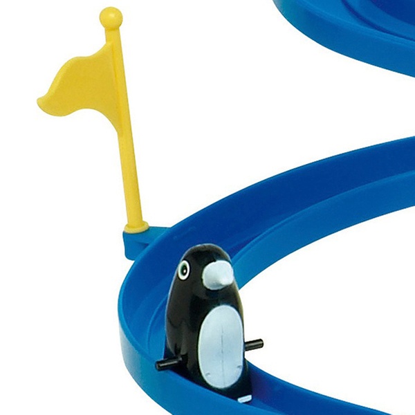 - Drei Pinguin-Figuren werden automatisch durch einen Aufzug nach oben transportiert und rutschen schnell die spiralenförmige Bahn hinunter