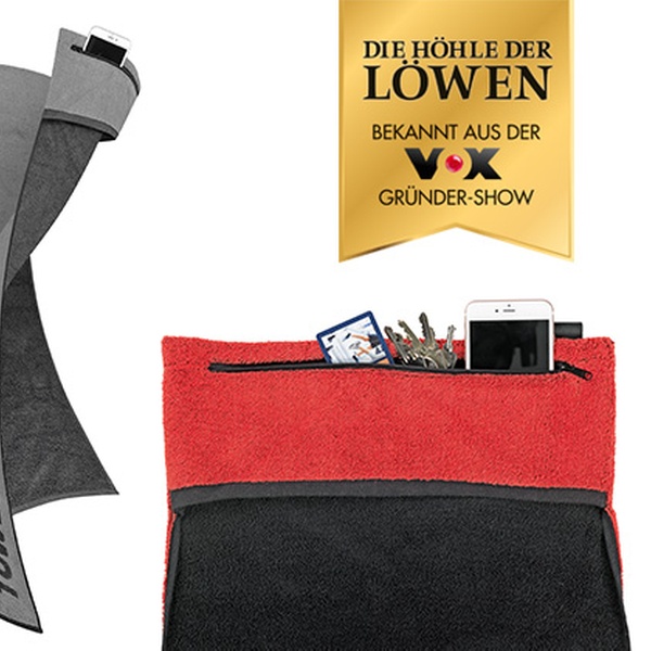 Cleveres Sporthandtuch für Fitnessfans mit Magnetclip zum Befestigen am Gerät und kleiner Tasche für Schlüssel oder den Mitgliedsausweis