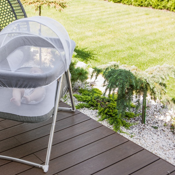 Praktisches Bett ausgestattet mit robusten Rädern für reibungslose Bewegungen und einem Moskitonetz für zusätzlichen Schutz