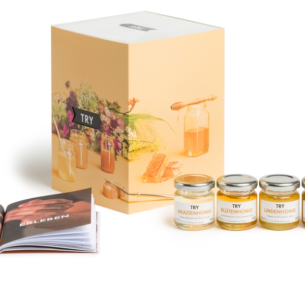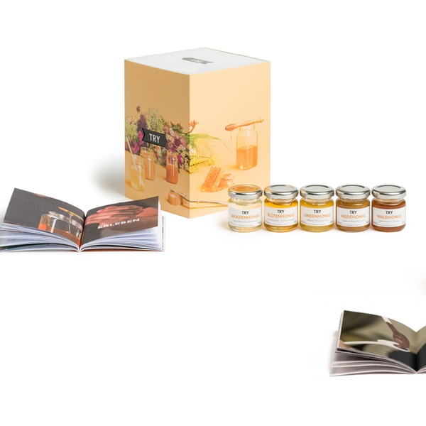- 250 g Honig, 60-seitiges Booklet TRY Honig und eine Kurzanleitung für eine Verkostung zu Hause