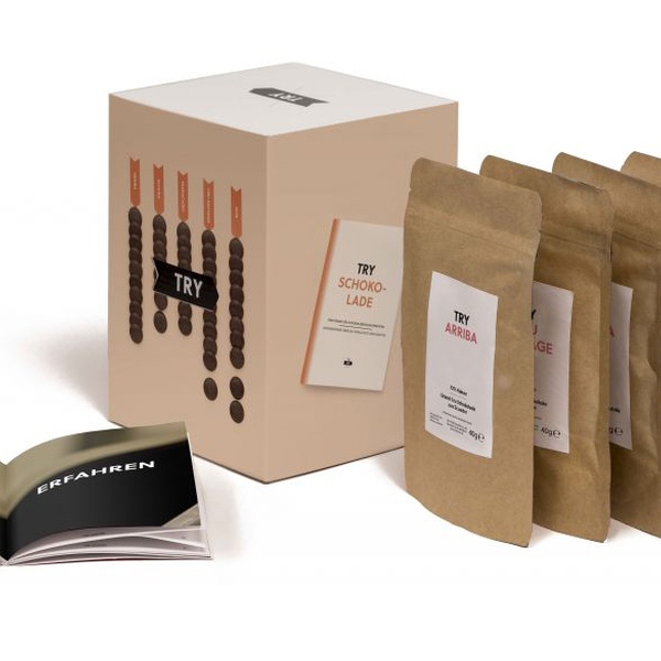 - 5x 40 g Schokolade, 60-seitiges Booklet TRY Schokolade und eine Kurzanleitung für eine Verkostung zu Hause