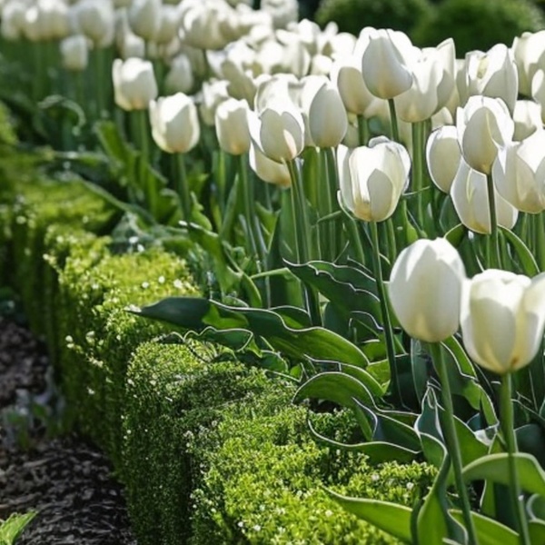 Diese Tulpe erstrahlt mit großen, gefüllten Blüten in Reinweiß, blüht im späten Frühling und sorgt für elegante Akzente im Beet oder Kübel