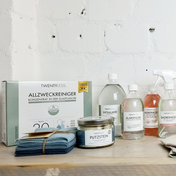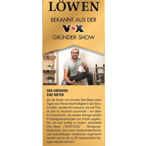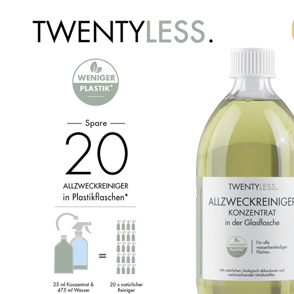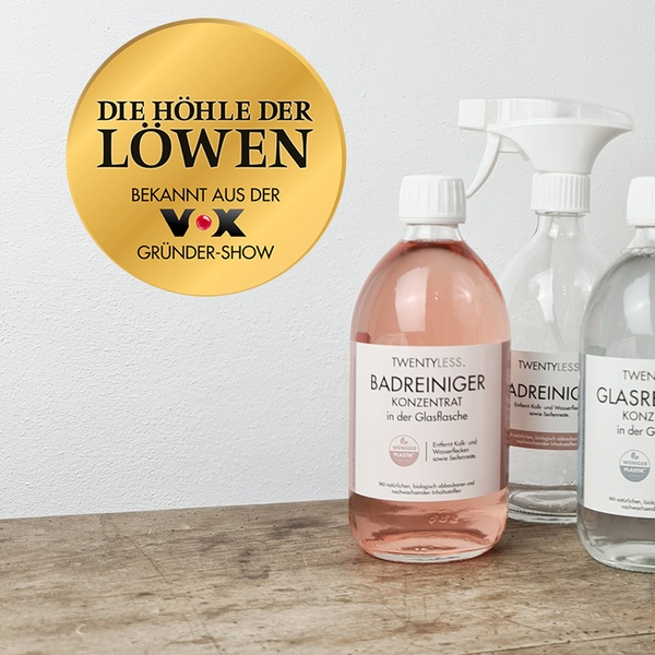 Twentyless – Zwanzig weniger. Genau soviel Plastikflaschen spart man ein, wenn man sich für ein Reinigungsmittel-Konzentrat von Twentyless entscheidet. Das Konzentrat kann einfach mit Wasser aufgefüllt werden. Neben Allzweckreiniger gibt es mit dem Glas- und Badreiniger alles was man für einen sauberen Haushalt braucht. Das Konzept mit der nachhaltigen Alternative zu herkömmlichen Reinigungsmitteln überzeugte auch bei der Gründershow „Höhle des Löwens“.